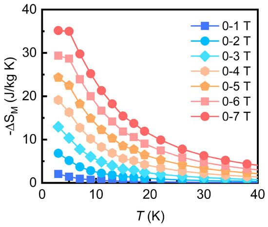 Although the compound exhibits a high saturation magnetization of 180 Am2/kg, a significant portion of the magnetic entropy () is lost due to strong antiferromagnetic interactions. Magnetic entropy change is an important parameter for evaluating the magnetocaloric effect. Based on the Maxwell relation, it is given by [25]. The temperature dependence of the magnetic entropy change for the Gd7(BO3)(PO4)2O6 compound under different magnetic fields is shown in Figure 5. As the magnetic field increases, the peak value of the appears to gradually shift towards higher temperatures, which is particularly evident under 7 T. This suggests that the compound may undergo a field-induced metamagnetic transition from an antiferromagnetic state to a ferromagnetic state under the influence of the magnetic field. This conclusion is obtained because the peak value of the in ferromagnetic materials shifts towards higher temperatures with an increasing magnetic field. Although the compound has an antiferromagnetic ground state, the results of the are sufficient to prove the correctness of this hypothesis, and similar results have also been observed in other compounds with antiferromagnetic interactions [26].