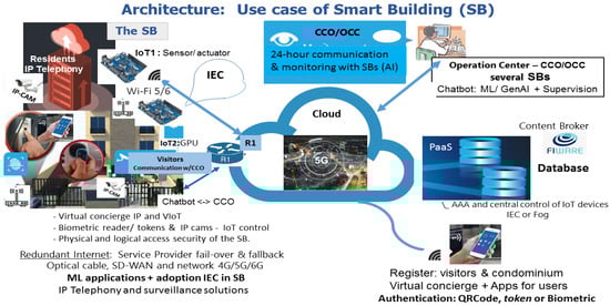 Conversely, for standalone Smart Buildings with a limited number of properties per tower (estimated at 20–60 units), this study concludes that a strategy employing IEC and IoT devices of types (1) and (2) at the Edge, leveraging simpler technological solutions within this condominium category, represents the optimal approach. Generally, these isolated SBs are sensitive to operational costs and initial investments. The adoption of open SDN architecture by cloud providers maintains the consistency of this approach and should be strongly considered.