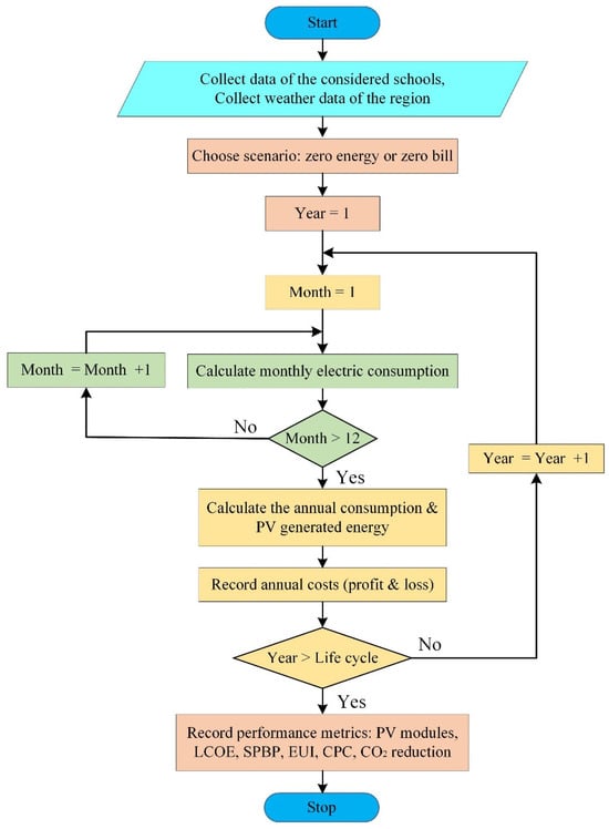 School buildings often consume electricity unwisely in hot regions. This problem can be solved by rationalizing consumption or securing the necessary energy by integrating solar energy with school buildings and facilities. Energy consumption, rationalization of energy consumption, and RE, especially solar energy, in educational buildings have been studied in the scientific literature. Dias Pereira et al. [7] conducted a literature analysis comparing the published school energy use statistics. The authors reported that the total annual EUI ranged between 10 kWh/m2 in Italy and 278 kWh/m2 in Japan. The authors also presented the electrical yearly EUI ranged between 7 kWh/m2 in Germany and 66 kWh/m2 in Northern Ireland. The thermal EUI was 42 kWh/m2 in Germany and 210 kWh/m2 in Sweden. Lizana et al. [8] reported that the annual EUI for heating and cooling ranged between 15.27 kWh/m2 and 34.82 kWh/m2 for school buildings with passive energy performance in Spain. Ahamad et al. [9] calculated the annual EUI for schools in a typical tropical Malaysian climate for four years, which ranged between 12 kWh/m2/year and 23 kWh/m2/year. Basarir et al. [10] evaluated the retrofit possibilities and building envelope design standards for a school structure about 60 years old. As a result, it was found that the most efficient retrofit technique—both in terms of cost and energy efficiency—was employed most frequently in Turkey throughout the heating season. According to this study, there will be a financial advantage in eight years. The authors claim that implementing a retrofit would reduce the building’s yearly fuel expenses by about one-third. Ali and Hashlamun [11] researched in Jordan to develop retrofitting strategies for school buildings without insulation. According to the findings, implementing these ideas can result in notable energy savings of up to 54% with a comparatively simple payback period (SPBP) of 5.5 years, proving their potential as an energy-efficient retrofitting solution for Jordanian school buildings.