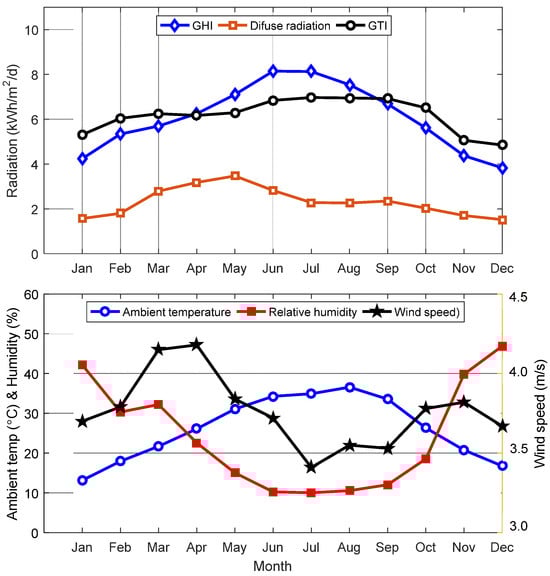 Qassim region’s average monthly weather data are derived from one-minute interval recordings [43]; GTI is the irradiance incident on a tilted plane at an angle equal to the city latitude.