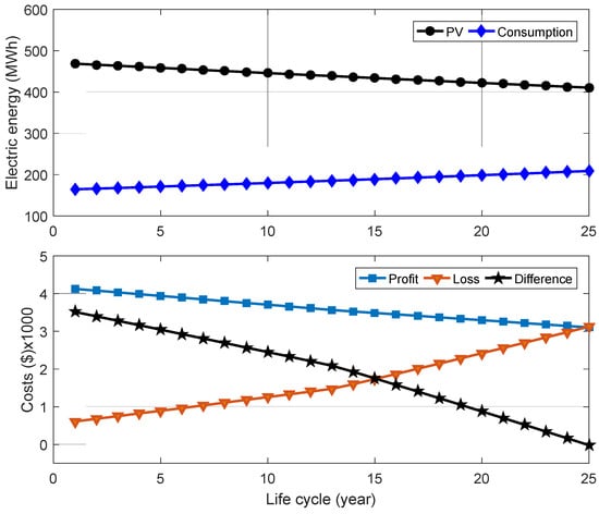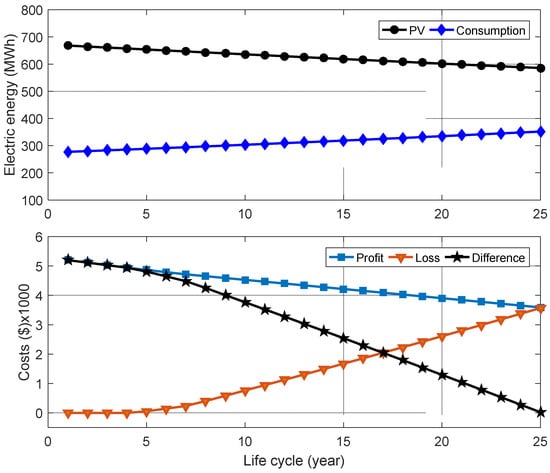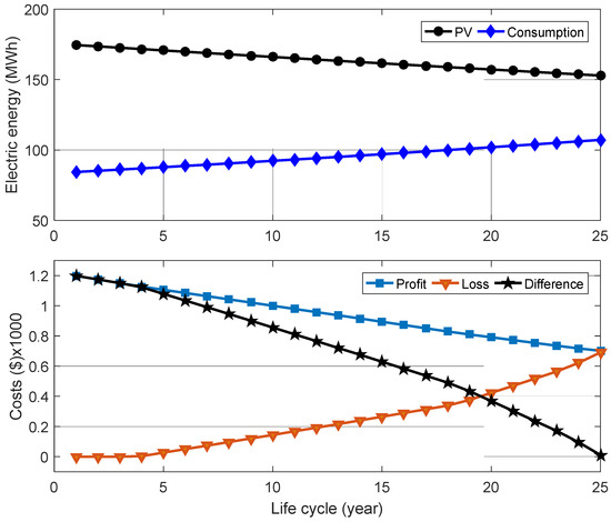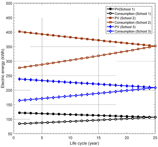 To achieve the nearly zero-bill scenario, Figure 4, Figure 5 and Figure 6 show the electricity consumption curve and the electricity produced by the PV systems with the economic indicators of the three schools throughout the systems’ lifetime. It is seen that the three systems exhibit comparable trend behavior. Given that electricity must occasionally be drawn from the grid, the figures show that the systems generate more than is required each year to offset the price differential between electricity generated and exported to the grid and electricity imported from the grid. As the load increases and the effect of the degradation factor of PV modules increases over time, the gap between the amount of energy generated by the PV system and the amount of consumed energy narrows. According to Figure 4 and Figure 5, the loss is constrained during the first five years of the system’s existence, which limits the gap between the price of power and its benefits. After that, the loss rises, and the economic return falls until the bills are almost zero.