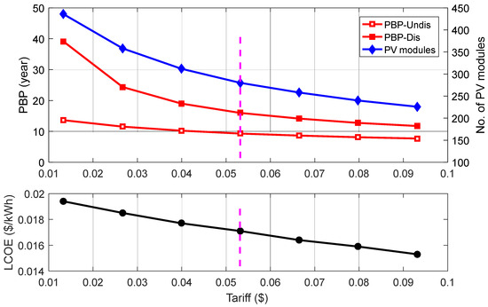 After, it became clear that the tariff of the electricity produced by the system and exported to the grid is a significant obstacle to integrating solar energy with school buildings. In this paragraph, the change in the tariff of the electricity exported to the grid was studied in relation to the feasibility of the systems. The price was changed from the current approved price of $0.0133 (≈SAR 0.05) per kWh to the cost of retrieving electricity from the public grid for the government sector, $0.0931 (≈SAR 0.36) per kWh to obtain a zero bill along the system’s life. The increase in the tariff led to a decrease in the number of PV modules required, the system capacity, and the SPBP for all systems. The SPBP became acceptable at $0.0532 (≈SAR 0.20 SAR) per kWh, which ranged between 8.52 and 15.98 years for undiscounted and discounted conditions, see Figure 7. The right of the dotted line represents the economically feasible region in the figures for the studied PV systems. The LCOE decreased for school 2 from $0.0124 to 0.0184, and for school 3 decreased from $0.0153 to 0.0194 per kWh. The price of electricity in the United States ranges between $0.11 and 0.30 per kWh in 2023, although it is usually less than $0.15 per kWh. The price of a unit of electricity produced from PV systems is between $0.06 and 0.08 per kWh [48]. Thus, it is often about half the price of a unit of energy imported from the grid. Therefore, it is proposed that the price of a unit of energy produced from the PV system for the government sector be raised to 50% of the price of imported electricity for these systems to be economically feasible in the KSA. Das et al. [49] used metaheuristic optimization techniques for a radio transmitter station in India to optimally design a PV system with energy storage. Gaabour et al. [50] summarized the most essential optimization works related to the design of hybrid PV–wind systems.