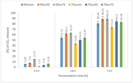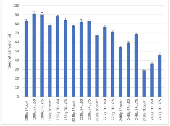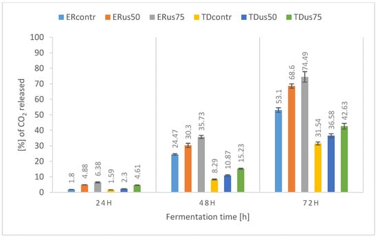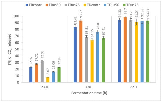 In the case of wort with an initial density of 22 °Blg (Figure 2), the positive effect of ultrasonic treatment is visible in the dynamics graph for both strains, including the final weight loss after 72 h of fermentation, with the maximum final values achieved for the ERus75 and TDus75 samples being 74.49% and 42.63% of theoretical fermentation, respectively. These results indicate that for the 22 °Blg wort, the assumed fermentation time (72 h) was too short to achieve complete fermentation, which is confirmed by the data on the utilisation of sugars (in particular fructose) presented earlier. A similar trend, i.e., delays between the assimilation of sugars and the production of ethanol and carbon dioxide from them, is reported by Hoang Nguyen Trans et al. [] during the fermentation of lignocellulosic hydrolysate by S. cerevisiae yeast. Other researchers have also presented similar data [,,].