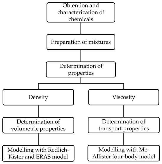 This section contains the characteristics of the materials used in this work, as well as the experimental methodology and the equations for the derived properties. The flowchart depicted in Figure 1 summarizes the experimental methodology followed in this work.