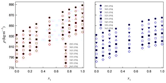 The experiments were carried out at 0.078 MPa (DPI 145, Druck, Leicester, UK); A vibrating tube densimeter (VTD) performed measurements in the range of 293.15–363.15 K. The VTD (DMA 4500 M, Anton Paar, Graz, Austria) contains a U-shaped measurement cell built in borosilicate. Two integrated platinum thermometers 100-Ω together with Peltier elements provide temperature control of the sample. VTD has an accuracy of 0.01 kg·m−3 provided by the supplier. Uncertainty in temperature was ±0.01 K. VTD was previously calibrated using dry air and water as reference fluids, as described previously []; air densities were extracted elsewhere [], while the water densities were obtained from the equation proposed by Wagner and Pruß []. The standard uncertainties for density and temperature were 0.2 kg·m−3 and 0.02 K; all the uncertainties reported in this work were determined according to the Guide to the Expression of Uncertainty in Measurement [].