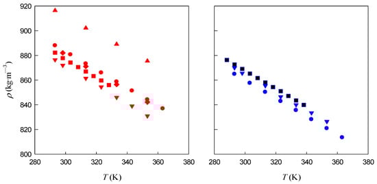 Density for biodiesel in comparison with other data found in the literature. Red and blue symbols denote waste cooking oil methyl ester biodiesel and waste beef tallow butyl ester biodiesel, respectively: ⬤, this work; ▼, Moradi et al. 2013 []; ■, Cano-Gómez et al. 2017 []; ◆, Aitbelale et al. 2019 []; ▲, NguyenThi et al. 2018 []; ⬤, this work; ▼, Moradi et al. 2013 []; ■, Vargas-Ibáñez et al. 2018 [].