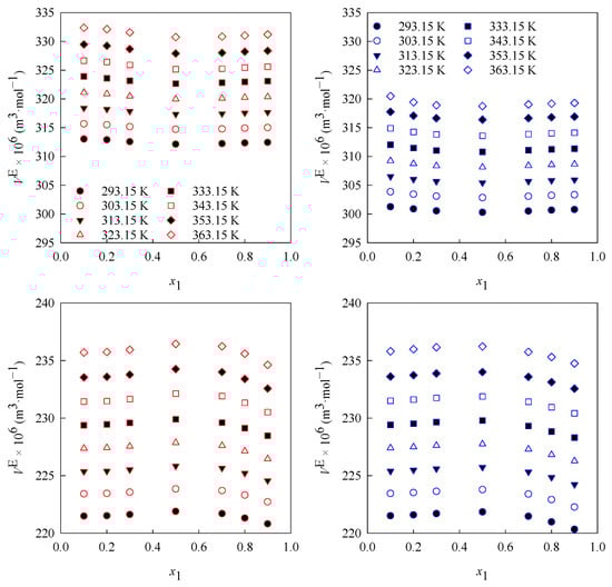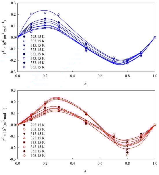 The excess molar volume () was calculated by the difference between the real and the ideal molar volumes in terms of Equation (1):