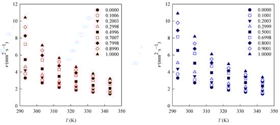Kinematic viscosity for biodiesel (1) + diesel (2) systems as a function of temperature. Symbols indicate different mole fractions of biodiesel (x1). Red and blue symbols denote waste cooking oil methyl ester biodiesel and waste beef tallow butyl ester biodiesel, respectively.