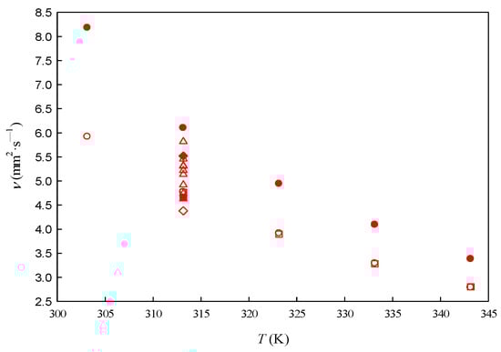 The kinematic viscosity () was experimentally determined in two calibrated capillary viscometers (Cannon-Fenske sizes 75 and 100) with a standard uncertainty of 0.14 mm2·s−1 by relating the elapsed time () with the viscometer constant () for each temperature, . The viscometers were immersed in a water container, which was subsequently thermally controlled by a circulating bath (PD07R, with a thermal stability of ±0.005 K, Polyscience, Niles, IL, USA); thermal stability of the water container was ±0.02 K. Temperature was measured by a calibrated platinum resistance probe 100-Ω, and the estimated standard uncertainty was 0.04 K.