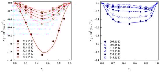 For excess viscosity, the isothermal values are plotted in Figure 10 as a function of composition along with calculated by the McAllister four-body model, whose parameters are declared in Table 8.