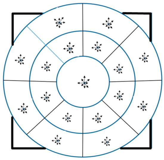 In the C-SURF algorithm, the improved SURF algorithm primarily focuses on optimizing the descriptor. The descriptor in this method is designed to extract logarithmic polar coordinates from the neighborhoods of key points obtained at different scales, thereby enhancing the accuracy of image registration. More specifically, the newly obtained neighborhoods in logarithmic polar coordinates are first divided into regions, segmenting the neighborhood into three blocks based on radial distances of 6, 9, and 15, while excluding the coordinates of the central pixel. Additionally, the area is divided into eight regions, resulting in a total of 17 sub-regions. Each sub-region calculates the gradient histogram in eight directions, ultimately yielding a 136-dimensional feature description. The specific construction process is illustrated in Figure 1.