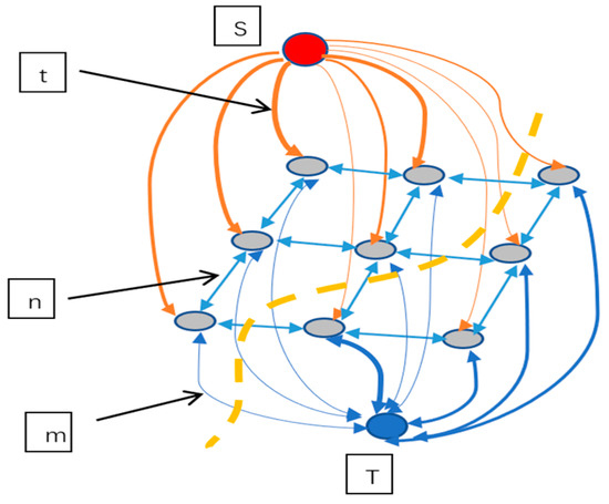A crucial step in the minimum cut and maximum flow algorithm is the identification of a connected graph. As depicted in Figure 2, assuming the source node is S and the sink node is T (hereinafter referred to as the S-T connected graph), the process involves the following: Pixels within the overlapping region correspond to nodes in the connected graph, with the nodes comprising a set of vertices V and a set of edges E. The network flow between the source and sink nodes traverses through various nodes within the overlapping region, assigning different weights based on distinct energy spectra. In the graph, the weights of the connections for network t are derived from the data term , for network n from the smoothness term , and for network m from the texture feature . Within the graph, the thickness of the network lines represents the magnitude of the weights; it is assumed that the closer the pixel values of two adjacent pixels p and q are to each other, the greater the weight assigned, indicating that pixel points p and q are likely from the same image. Conversely, if the pixel values are dissimilar, the two pixels may originate from two different source images. Thus, the S-T connected graph based on the overlapping region’s pixel points between different images is essentially formed.