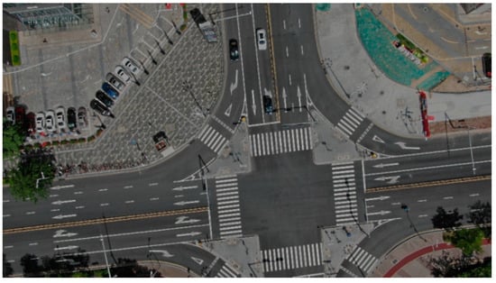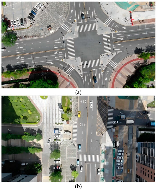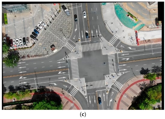 The original UAV aerial photo display. (a–c) are the aerial photographs of streets collected from different locations.