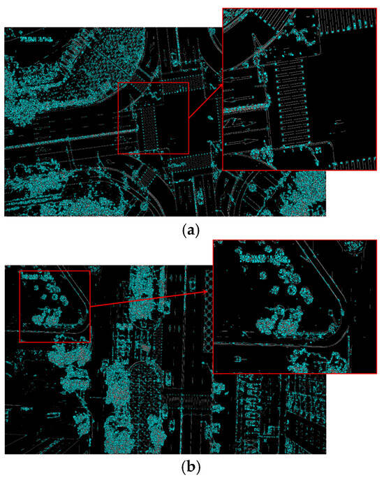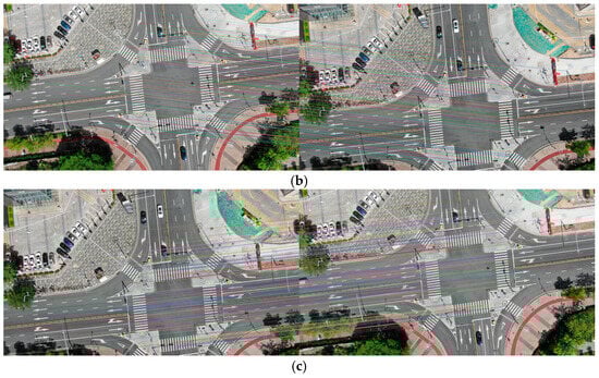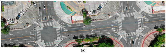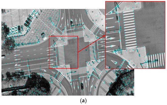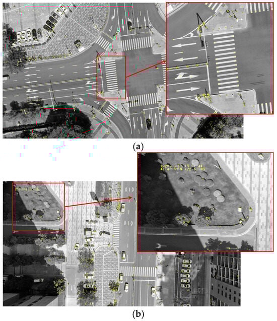 After applying the SIFT algorithm for feature extraction on the drone-captured images, instances of feature point omission were observed at the location of the crosswalk in Figure 6a and at the edge of the flowerbed in Figure 6b.