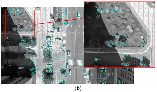 According to the detection results shown in Figure 7, the feature extraction results of the SURF algorithm also exhibit the same issue. Instances of feature point omission are observed at the location of the crosswalk in Figure 7a and at the edge of the flowerbed in Figure 7b.