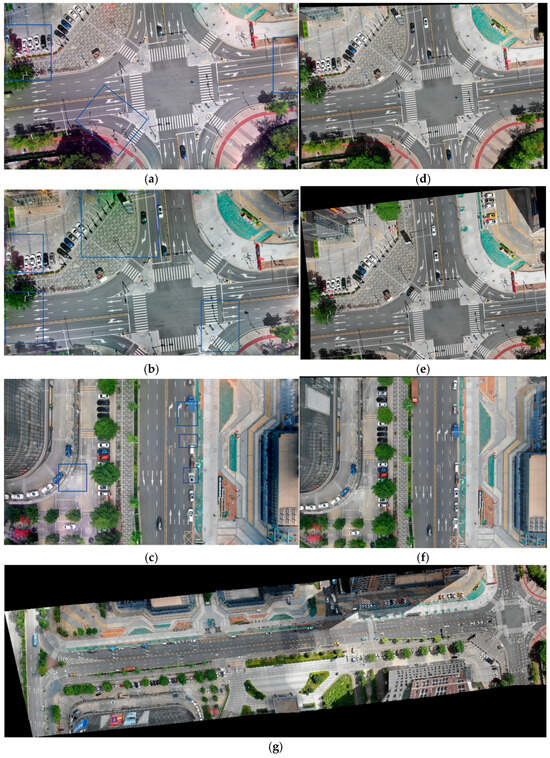 The source images captured by drones contain moving objects, such as individuals riding electric bicycles and cars. Representative images were selected for stitching comparison, with Figure 9 illustrating the results of the image stitching process. Specifically, Figure 10a–c depicts the results of image stitching using traditional energy functions, while Figure 10d–f shows the results obtained using the improved the novel energy function. It is evident from Figure 10a–c that the results of image stitching with traditional energy functions exhibit noticeable illumination variations and ghosting artifacts at their edges. In contrast, the use of the improved the novel energy function for image stitching effectively addresses the illumination, exposure, and ghosting issues that traditional algorithms could not resolve. Subsequently, SNR analysis was conducted on the image stitching results, revealing SNR values of 13.1504, 12.7692, and 11.9154 for Figure 10a–c, and SNR values of 36.2802, 35.9015, and 36.3165 for Figure 10d–f. The average SNR of the stitched images based on the novel energy function exceeds 36, indicating excellent image quality and laying a solid foundation for target extraction tasks based on panoramic images.