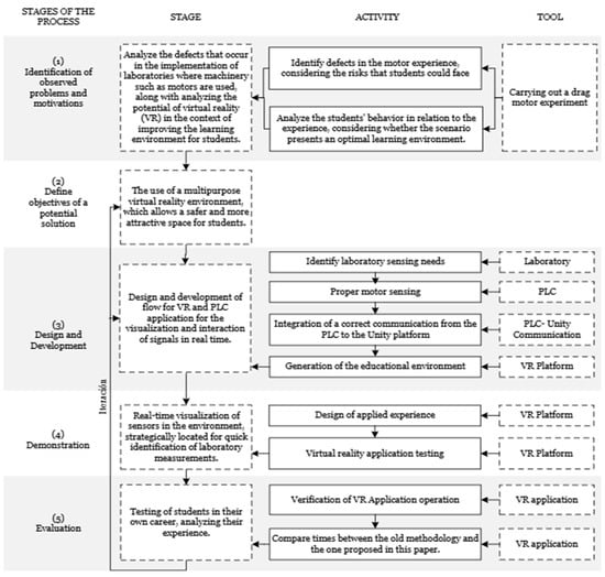 This research addresses and proposes the integration of virtual reality and real-time sensing technologies for the development of a collaborative, safe, and interactive environment, aimed at improving the learning experience of students in work that involves the use of high-capacity engines. To achieve this, the Design Science Research Methodology (DSRM) was used, recognized in the field of design science for its ability to systematically structure the research process. The following stages were considered: (1) Identification of observed problems; (2) Definition of objectives of a potential solution; (3) Design and development; (4) Demonstration; and (5) Evaluation. Figure 1 shows the stages, activities, and tools needed to carry out this research.