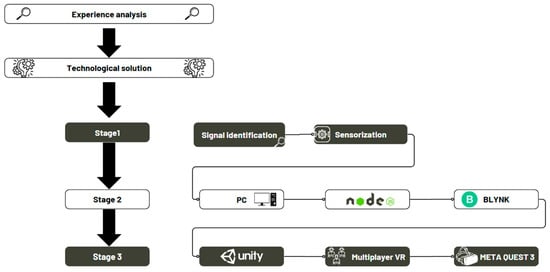 Since the proposal includes the use of virtual reality and real-time sensing, a development flow of the technological solution used to carry out the new laboratory methodology was implemented. This flow is subdivided into three stages. These stages comprise (1) the identification of essential signals for the laboratory and the sensorization by means of a PLC; (2) the communication of this with a server; and (3), finally, the integration of the data in a multi-user environment developed in Unity 3D.