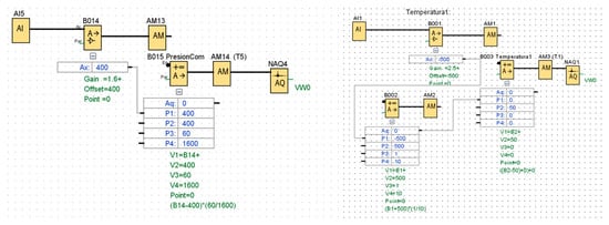 Figure 4 presents the configuration of the program implemented in the PLC, designed to guarantee the correct acquisition and processing of the signals coming from the sensors. First, the operating range within which the recorded analog signals can fluctuate is established, ensuring that the data is interpreted accurately. Subsequently, through a conversion based on simple rules of three, the analog values obtained are transformed to their corresponding scale, allowing the correct visualization and interpretation of them within the system. This procedure is essential to normalize the data and facilitate their integration into the digital environment, ensuring a consistent representation of the physical variables monitored in real time.