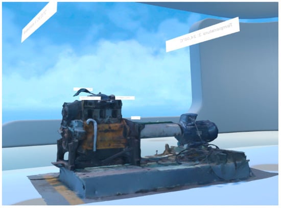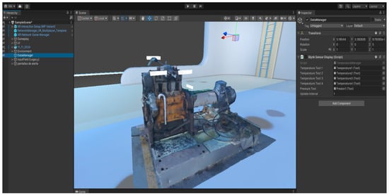 With the real-time sensing implemented, a multi-user environment was developed that included a scanned model of the engine used in the laboratory. In this virtual environment, interactive visualizations of the data captured by the PLC sensors were integrated, positioning them in the corresponding locations of the digital model. Subsequently, functional tests were performed to evaluate the accuracy and efficiency of the system.