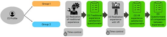 The survey was divided into four sections: (1) Profile; (2) Experience and satisfaction survey of the traditional experience without VR; (3) Experience and satisfaction survey of the proposed experience with VR; (4) Comparison survey between experiences. This can be seen in Figure 8.