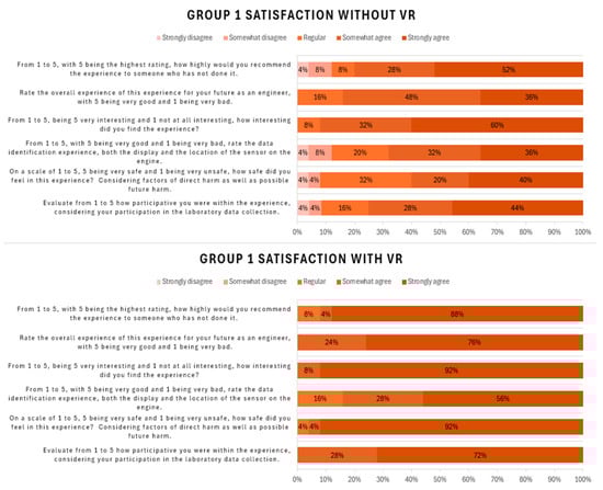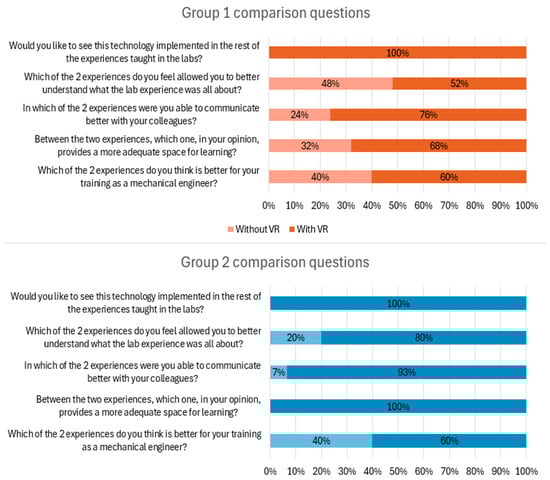 Furthermore, virtual reality was widely recognized as providing a more suitable and effective learning environment. In both groups, students acknowledged that VR not only enhanced their ability to engage with the material but also fostered a more interactive and immersive experience. This, in turn, contributed to a deeper understanding of the laboratory process and reinforced its value in engineering education.
