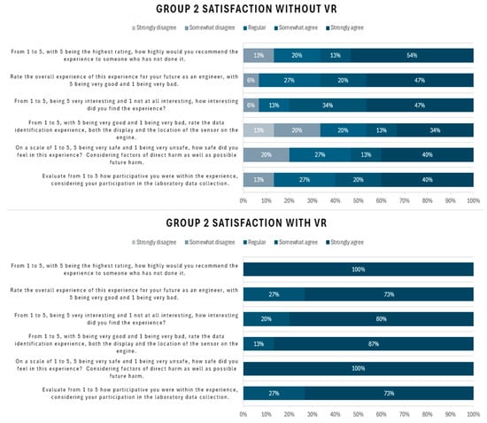 The survey was designed to cover four fundamental aspects: to gather information about the participant’s profile, to measure satisfaction with the traditional experience without virtual reality, to evaluate the proposed experience that incorporates virtual reality and real-time sensing, and to analyze both methodologies comparatively. The instrument was applied at three key moments: before the experiences, to record the students’ profiles; after the traditional experience, to capture their immediate perceptions; and at the end of the experience with virtual reality, to evaluate both their satisfaction with the proposal and the perceived differences with respect to the traditional method.