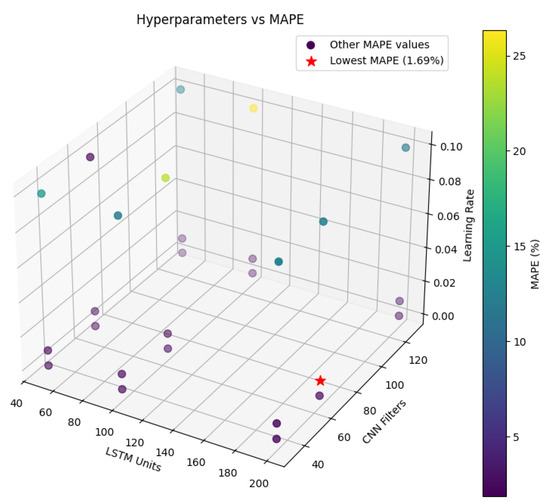A visual representation of the hyperparameter analysis is provided in Figure 2, which illustrates the relationship between LSTM units, CNN filters, learning rate, and MAPE across all tested configurations.