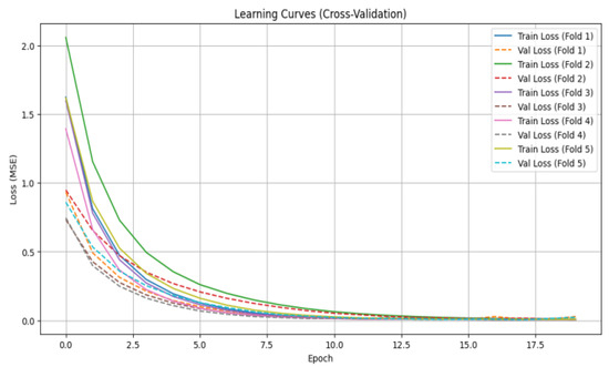 The learning curves derived from the five-fold cross-validation of the proposed CNN-LSTM model with an attention mechanism demonstrate robust performance and effective generalization for electricity demand forecasting, as illustrated in Figure 5. The implementation of early stopping, with a patience of 5 epochs, successfully halted training around 10–15 epochs, preventing overfitting and ensuring stable validation loss across all folds. The close alignment between training and validation losses, facilitated by regularization techniques such as dropout, L2 regularization, and batch normalization, underscores the model’s ability to capture the inherent seasonality and trends in electricity demand without memorizing noise.