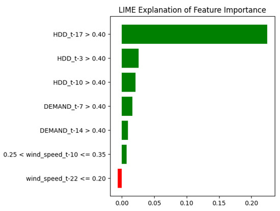 The LIME feature importance analysis for the electricity demand prediction at a randomly selected timestamp, derived from the CNN-LSTM-Attention model, reveals the primary factors shaping this single instance, as presented in Figure 6. The HDD emerges as the most influential, with the HDD at a 17-day lag (HDD_t-17 > 0.40) exhibiting the greatest positive contribution (weight ≈ 0.225), followed by HDD_t-3 (>0.40, ≈0.026) and HDD_t-10 (>0.40, ≈0.021). These results underscore the pivotal role of temperature-related features across various lags in driving the demand forecast for this specific case. Furthermore, prior demand values at lags of 7 and 14 days (DEMAND_t-7 > 0.40, ≈0.016; DEMAND_t-14 > 0.40, ≈0.009) positively influence the prediction, highlighting the model’s dependence on historical demand trends for this timestamp. Wind speed features display opposing effects: moderate wind speed at a 10-day lag (0.25 < wind_speed_t-10 ≤ 0.35, ≈0.007) boosts the predicted demand, while low wind speed at a 22-day lag (wind_speed_t-22 ≤ 0.20, ≈−0.006) exerts a minor negative impact. These results highlight the model’s strength in integrating diverse temporal and meteorological inputs, with the HDD and lagged demand emerging as dominant predictors. This interpretability, grounded in the feature importance analysis, enhances the model’s reliability and practical value for electricity demand forecasting, demonstrating its capacity to model complex real-world dynamics.
