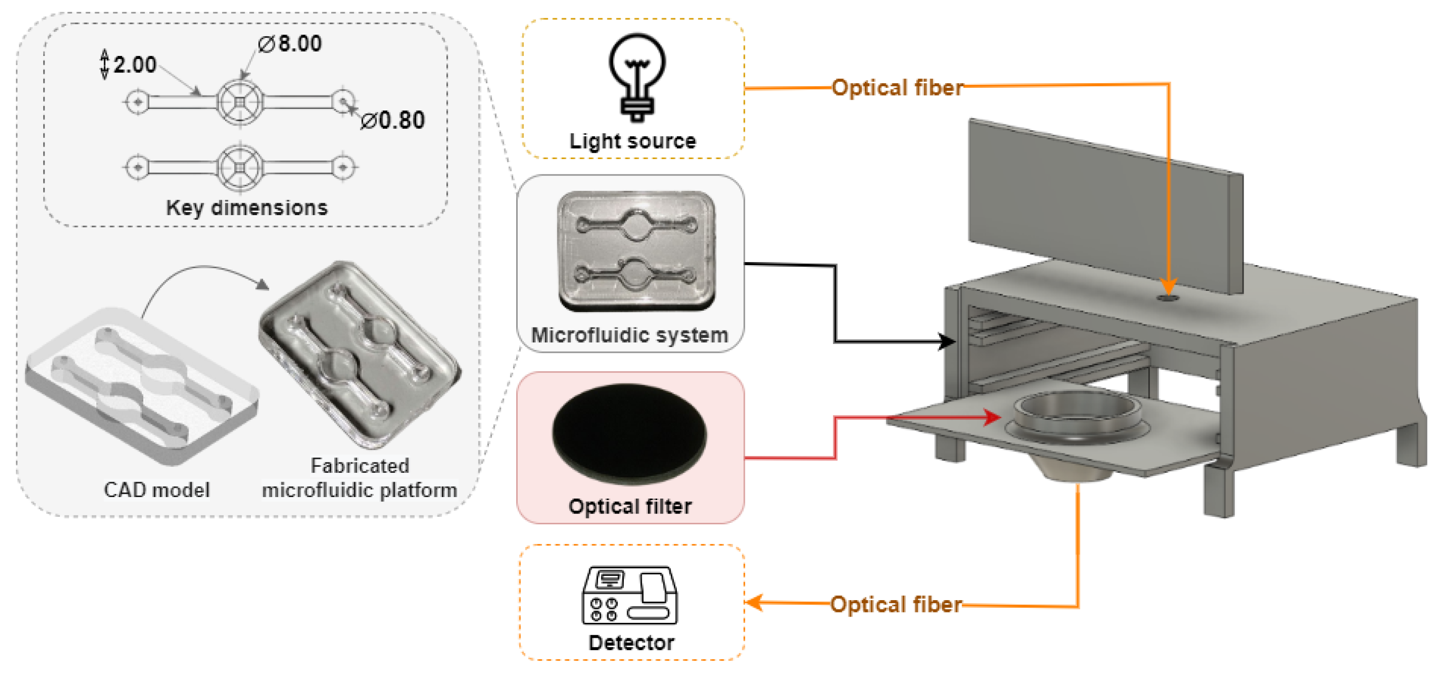 For the fluorescence experiments, this device was integrated into a custom-designed setup created with Fusion AutoCAD software (version 2.0.20508). This setup was engineered to ensure precise component alignment and to minimize light interference during fluorescence detection. As illustrated in