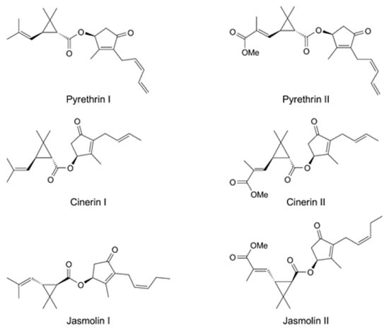 Chemical structures of pyrethrin I and II, cinerin I and II, and jasmolin I and II [10].