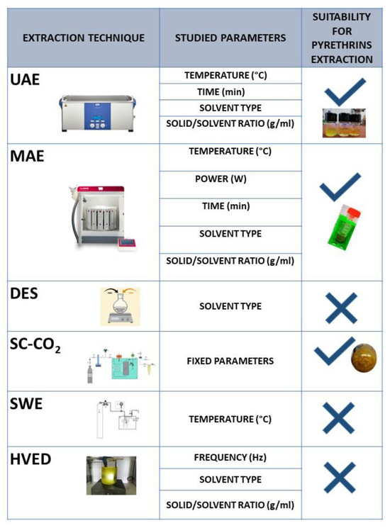 UAE, MAE, DES, SC-CO2, SWE, and HVED extraction techniques, studied parameters, and suitability for pyrethrin extraction.