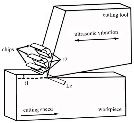 In ultrasonic-assisted cutting, the contact mode between the cutting tool and workpiece involves a micro reciprocal vibration interaction during the cutting process. The ultrasonic waves continually impact and squeeze the workpiece material being machined through high-frequency vibrations, resulting in advantages such as uniform cutting volume, shorter cutting strokes, easy chip removal, effective heat dissipation, and cutting tool wear reduction. Additionally, when ultrasonic-assisted machining is used with cutting fluid, a pumping effect phenomenon occurs, allowing the cutting fluid to more easily enter the cutting area. Studies have shown that incorporating appropriate ultrasonic vibrations during the cutting process can effectively reduce burrs, lower cutting forces and vibrations, improve surface quality, reduce tool–workpiece friction, minimize dimensional accuracy errors, and extend cutting tool life. A schematic diagram of the ultrasonic-assisted cutting model is shown in Figure 1.