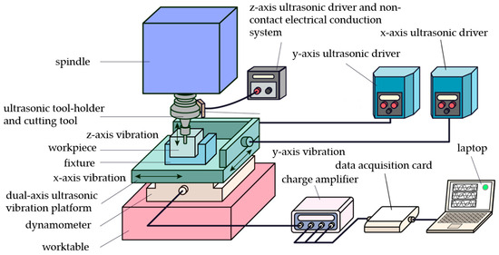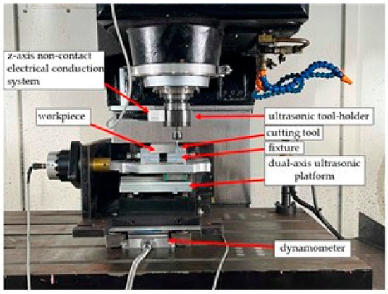 Figure 4 and Figure 5 show a schematic diagram of the side milling experiment setup and the related photos depicting the ultrasonic system and driver, measurement devices, and milling equipment configurations. In this setup, single-axis (z-axis) ultrasonic-assisted milling, i.e., rotary ultrasonic vibration is imposed on the rotary spindle system, which is controlled by adjusting the voltage levels through an ultrasonic driver, and the ultrasonic cutting tool holder is powered by a non-contact electrical conduction system. Dual-axis (xy-axis) ultrasonic-assisted milling is organized and completed by a vibration platform which is also controlled by adjusting the voltage levels through the individual ultrasonic driver. This dual-axis ultrasonic platform is mounted on the worktable. Both of the above two ultrasonic systems are integrated together constituting a triple-axis (xyz-axis) ultrasonic system as shown in Figure 5. The resonant effect was used to achieve the reciprocal oscillations along the z, y, and x axes at a high frequency ranging from 20 to 40 kHz and an amplitude ranging from 3 to 10 µm. Data collection was performed using a dynamometer to capture cutting force signals along the x, y, and z directions. Through a charge amplifier, the cutting force signals were amplified and converted into voltage signals. Signal acquisition cards were used to capture the three cutting force components during the machining processes at a sampling rate of 50 kHz. After each machining pass (60 mm cutting distance) was completed, the cutting tool was photographed using a tool microscope, and its flank wear on the flank face, VB, was observed and measured for each experimental set. The side milling experiments for data collection were conducted subject to these ultrasonic-assisted techniques using the process parameter combinations just mentioned above. A total of 51 sets of cutting force signals and the relevant cutting performance were collected in Phase 1 and 2 experiments for further analyses.