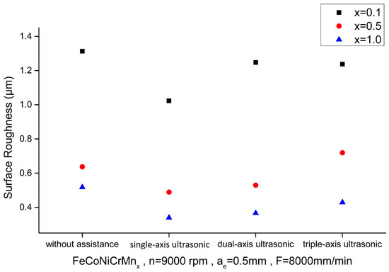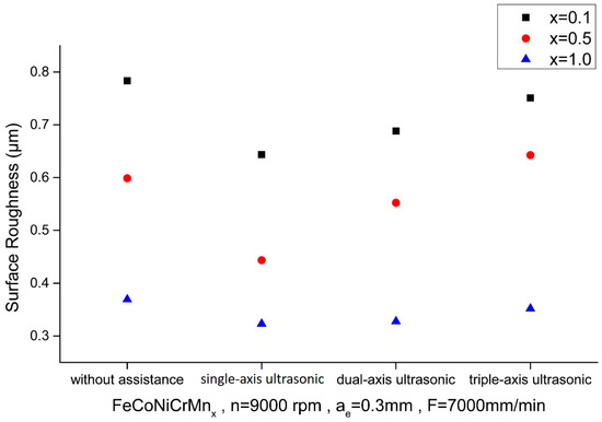 Figure 6 and Figure 7 show the comparisons of surface roughness, Ra, of the HEAs with different elemental ratios using the Set 1 and 2 process parameters, respectively, in the first phase experiment subjected to different ultrasonic-assisted milling techniques. The surface roughness under lower cutting conditions (Set 1) is better than that of the higher ones (Set 2) for almost all the depicted cases. Among the ultrasonic-assisted milling techniques, the single-axis ultrasonic assistance induces a better result, while milling without assistance shows the worst cutting performance. The results obtained from the dual-axis and triple-axis ultrasonic assistances just fall between these above two extremes. This can be attributed to the fact that single-axis ultrasonic assistance provides the vibration along the z-direction accompanied by rotary action, which helps to stabilize the cutting process. This stable vibration pattern may effectively reduce the surface roughness and the quality of the machined surface is thus improved. On the other hand, HEAs may respond less effectively to multi-axis vibrations than to single-axis vibration, since multi-axis vibrations may complicate the internal stress distributions within the workpiece material, affecting the cutting performance ultimately. In comparison to the non-assisted technique, the surface roughness for single-axis could be reduced by approximately 12.5%, 25.9%, and 17.86% for a Mn elemental ratio varying from 0.1 to 1.0, respectively, using the Set 1 process parameters, while reductions of 22%, 23.2%, and 34.4% are found using the Set 2 process parameters.