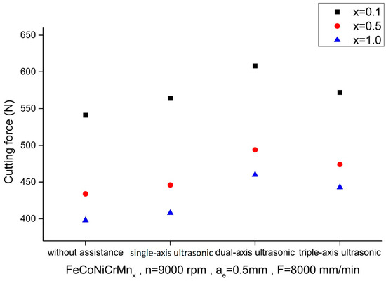 Figure 8 and Figure 9 show the comparisons of cutting force of the HEAs with different elemental ratios using the Set 1 and 2 process parameters, respectively, in the first phase experiment subjected to different ultrasonic-assisted milling techniques. When milling with single-axis ultrasonic assistance, the cutting force exhibited a slight increase. This may be because, although ultrasonic vibrations may reduce the tool-–workpiece frictional constraint, their high-frequency contact intensifies the interaction between the tool and workpiece, preventing the overall cutting force from decreasing. The cutting force was considerably increased with dual-axis ultrasonic assistance, possibly because the ultrasonic vibrations acted simultaneously in two axial directions, leading to non-uniform material removal behavior and cutting resistance was thus increased. The cutting force was also increased with triple-axis ultrasonic assistance, which was contrary to expectations. This could be attributed to the triple-axis vibrations causing more interference to the cutting tool in various axial directions, but rotary ultrasonic assistance (single-axis) was included, which induces the cutting forces to be slightly less than those of dual-axis. Overall, these results indicate that the cutting force may be reduced by ultrasonic assistance theoretically but complex multi-axis vibration dynamics may irregularly disrupt the workpiece material removal mechanism in practical applications. Moreover, as the Mn elemental ratio varied from 0.1 to 1.0, the cutting force was shown to be positively decreasing. The lower Mn content was insufficient to enhance the alloy’s toughness and wear resistance effectively, resulting in a greater compression force acting on the cutting tool during the cutting process.