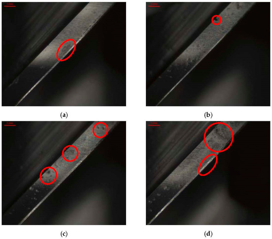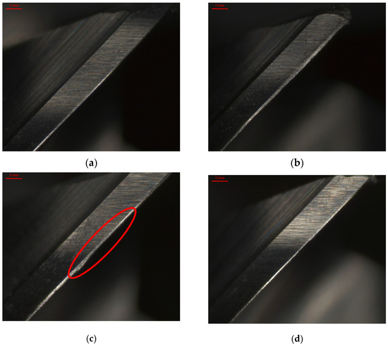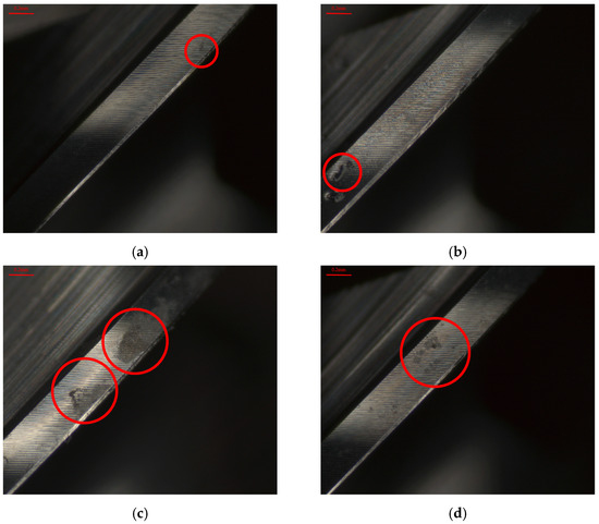 Cutting tool wear of the HEA for x = 0.1 using the Set 1 process parameters in the first phase experiment subjected to different ultrasonic-assisted milling techniques. (a) Without assistance. (b) Single-axis ultrasonic. (c) Dual-axis ultrasonic. (d) Triple-axis ultrasonic.