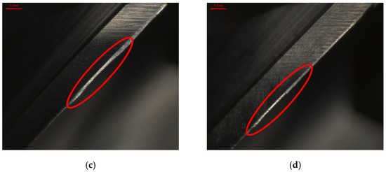 Cutting tool wear of the HEA for x = 1.0 using the Set 2 process parameters in the first phase experiment subjected to different ultrasonic-assisted milling techniques. (a) Without assistance. (b) Single-axis ultrasonic. (c) Dual-axis ultrasonic. (d) Triple-axis ultrasonic.