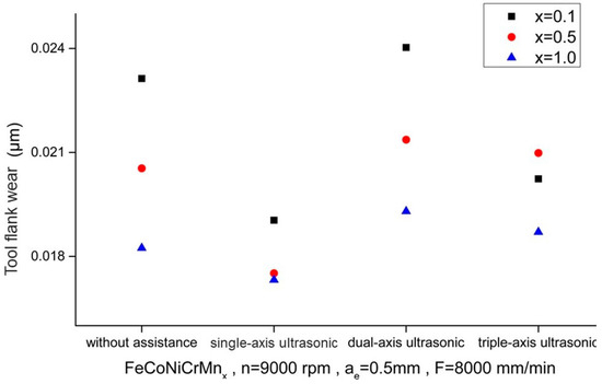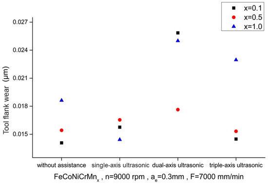 Figure 14 and Figure 15 show the comparisons of cutting tool wear of the HEAs with different elemental ratios using the Set 1 and 2 process parameters, respectively, in the first phase experiment subjected to different ultrasonic-assisted milling techniques. In comparison to milling without assistance, the cutting tool wear for single-axis under lower cutting conditions (Set 1) was increased with the Mn elemental ratio varying from 0.1 to 0.5 but it was decreased for the Mn ratio of 1.0. They all increased for various Mn ratios in the dual-axis situation and it increased only for the Mn ratio of 1.0 with triple-axis assistance, while for higher cutting conditions (Set 2), the cutting tool wear decreased with all Mn elemental ratios using single-axis ultrasonic assistance but exhibited an increasing trend for all ratios with dual-axis and triple-axis assistance, except for the Mn elemental ratio of 0.1 in triple-axis assistance which showed a decrease, as compared with milling without assistance.