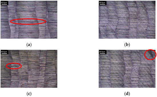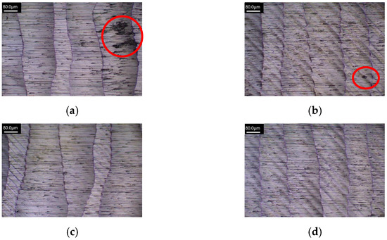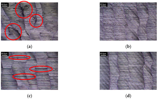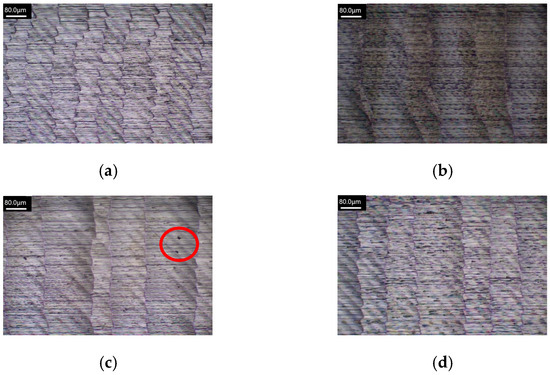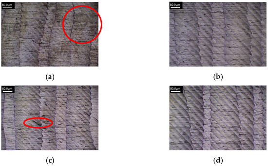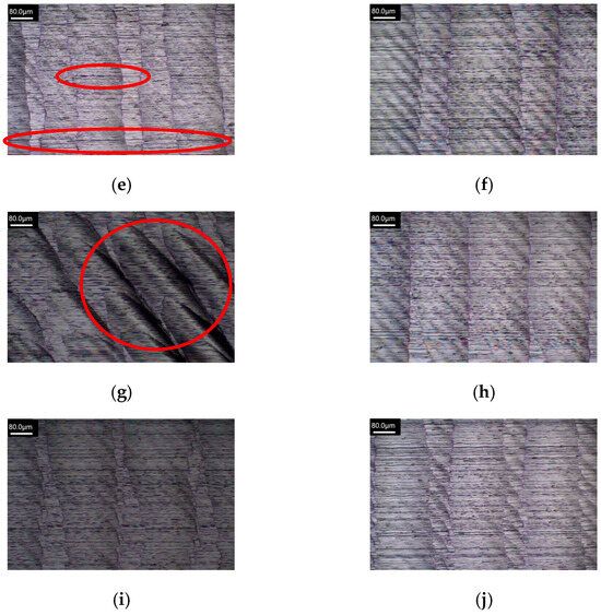 Figure 16, Figure 17, Figure 18 and Figure 19 show the machined surface morphology of the HEAs with Mn elemental ratios of x = 0.1 and x = 1.0, respectively, using the Set 1 and 2 process parameters in the first phase experiment subjected to different ultrasonic-assisted milling techniques. It can be observed that using different cutting parameters and with different elemental ratios, the workpiece surface morphology in milling without assistance is coarser and exhibits poorer surface quality, indicated by red boxes in Figure 16a, Figure 17a, Figure 18a and Figure 19a, as compared to those with ultrasonic assistance which demonstrate different extents of improvement in surface quality. The introduction of high-frequency vibrations in ultrasonic-assisted milling effectively reduces residual chips on the workpiece surface and minimizes heat generation, thereby mitigating the effects of plastic deformation and thermal stresses. Due to the effects of ultrasonic vibration, the cutting marks generated at the tool–workpiece interface may become more uniform, resulting in fewer surface defects and an improved surface finish, surface roughness is reduced ultimately.