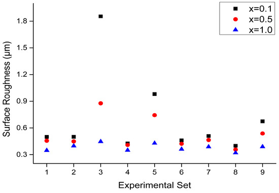 Figure 20 shows the comparison of surface roughness, Ra, using different cutting parameter combinations of the L9 orthogonal array in the second phase experiment for different elemental compositions. It can be seen that among all sets in this phase, the surface roughness varies from 0.40 to 1.85 μm for x = 0.1 while it is distributed between 0.32 to 0.44 μm for x = 1.0. Hence, surface roughness is reduced from 22.03% to 314.21% for the latter composition compared with the former one. Particularly, the surface roughness is evidently higher in Sets 3, 5, and 7 regardless of the x variations. Furthermore, in these sets, the surface roughness is increased with a decrease in the x value with higher radial depths of cut. Among these sets, the most significant variation is in Set 3, where the surface roughness for x = 0.5 and x = 0.1 increases by 96.02% and 314.21%, respectively, as compared to x = 1.0, which indicates that higher radial depths of cut may lead to a significant deterioration in surface roughness. Moreover, as the spindle speed is increased, the surface roughness for different x variations shows a gradual decreasing trend. This suggests that increasing the spindle speed has a positive effect on improving the surface quality. At the higher cutting speed, the cutting processes tend to be stable, helping the surface roughness to be reduced. Additionally, it can be observed that higher feed rates result in poorer surface roughness. For example, when the feed rate is high, material removal rate and cutting force are increased accordingly, and larger surface roughness is deduced since chip removal from the workpiece becomes less effective.