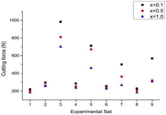 Figure 22 shows the comparison of cutting force using different cutting parameter combinations of the L9 orthogonal array in the second phase experiment for different elemental compositions. It can be seen that among all experimental sets in this phase, the cutting force is varied from 230 to 980 N for x = 0.1 while it is distributed between 180 to 700 N for x = 1.0. Hence, cutting force is reduced from 3.64% to 54.45% as the latter composition compared with the former one. The largest cutting force was induced in Set 3, particularly in the case corresponding to x = 0.1. In contrast, the cutting forces for x = 0.5 and x = 1.0 are sequentially reduced within the same experimental set and the similar trends are also noted in Sets 5 and 7. This indicates that with a high radial depth of cut, the alloy compositions significantly influence the cutting force, especially when the x value is lower (x = 0.1), where the cutting force is notably increased.