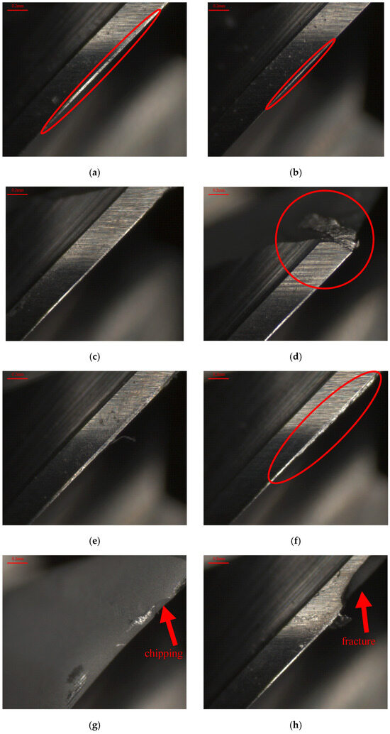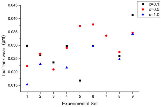 On the other hand, as the feed rate was increased from 4000 to 6000 mm/min, the flank wear marks, VB, on the cutting tool surface become more pronounced as indicated by the red boxes in Figure 23d,f. This is especially evident in the alloy with x = 0.1, where the high feed rate leads to severe flank wear and damage on the cutting tool surface. In contrast, while flank wear was also increased as feed rate was increased for materials with x = 0.5 and x = 1.0, the extent of the wear is relatively small. This demonstrates that increasing feed rate accelerates cutting tool wear, making the tool more susceptible to damage. With the increase in radial depth of cut, the contact area between the tool and workpiece is increased accordingly, leading to higher cutting loading and frictional heat, both of which contribute to intensify the tool wear. In Figure 23, it can be observed that as the radial depth of cut is increased from 0.3 to 0.7 mm, the flank wear marks on the tool surface become more prominent as indicated by the red boxes in Figure 23d,g,h, particularly in the materials with x = 0.1 and x = 1.0. These flank wear marks reflect the different wear behaviors of the tool under high-stress and high-temperature conditions. With the higher hardness and strength properties in the case of the x = 1.0 material, the cutting tool is prone to fracture due to the high loading impact at the beginning of tool–workpiece engagement. On the other hand, with the higher ductility and plasticity of the x = 0.1 material, the chips may not be removed completely from the workpiece material, resulting in a built-up edge on the tool surface, which generates excessive friction and heat accumulation, ultimately causing cutting edge chipping. As the spindle speed is increased, the higher speeds enhance cutting efficiency and surface quality while frictional heat and tool wear may also be deduced. Figure 24 shows the comparison of cutting tool wear using the process parameter combinations of the L9 orthogonal array in the second phase experiment for different elemental compositions. It can be observed that with increasing spindle speed, there are two distinct phenomena in cutting tool wear. For softer materials such as x = 0.1, high spindle speeds may lead to severe wear marks on the tool surface, as the heat accumulation at high speeds accelerates tool wear and damage as indicated by the red boxes in Figure 23g. However, for harder materials such as x = 1.0, at an appropriately high spindle speed tool wear may be reduced because the increase in spindle speed may decrease the feed per tooth for a constant feed rate, and thereby the cutting loading and tool wear are reduced.
