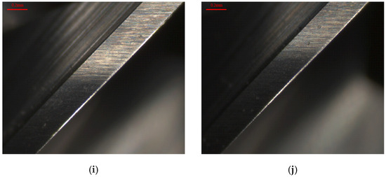 Cutting tool wear using the process parameter combinations of the L9 orthogonal array in the second phase experiment. (a) x = 0.1, Set 1. (b) x = 1.0, Set 1. (c) x = 0.1, Set 3. (d) x = 1.0, Set 3. (e) x = 0.1, Set 6. (f) x = 1.0, Set 6. (g) x = 0.1, Set 7. (h) x = 1.0, Set 7. (i) x = 0.1, Set 8. (j) x = 1.0, Set 8.