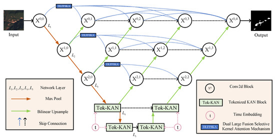 Based on the efficiency and interpretability of the KAN, the U-KAN has been proposed as a novel network architecture, demonstrating remarkable performance in medical image processing tasks [45]. However, the relatively simple structure of the U-KAN is still insufficient to capture subtle differences in a landslide area. To compensate for this shortcoming, we introduce the Tok-KAN and incorporate it into the U-Net++ framework. The Tok-KAN further enhances the learning ability of landslide image features by effectively extending the KAN based on the nested skip connection and multi-scale feature fusion mechanism of U-Net++. This design enables the model to integrate information and capture details at a deeper level, thereby significantly improving the overall performance of the landslide image segmentation task. Figure 2 shows the overall structure of the Tok-KAN.