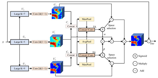 Secondly, a convolution with a kernel size of one is applied to , obtaining the feature representation from different large kernel convolutions as shown in Equation (8):