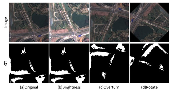 The DLRSD-Expand dataset was enlarged by a factor of four, increasing the total number of images to 8252. The expanded dataset was then randomly divided into a training set and a testing set at an 8:2 ratio, resulting in a training dataset comprising 6602 images and a testing dataset with 1650 images. The visual examples of the augmented original images (Image) and their corresponding ground truth annotations (Ground Truth (GT)) are shown in Figure 5.