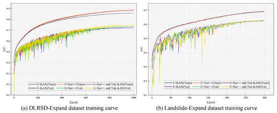 On both the DLRSD-Expand and Landslide-Expand datasets, integrating the Tok-KAN with U-Net++ led to significant improvements in the IoU on the validation set, demonstrating the model’s enhanced generalization ability. While the IoU on the training set was slightly lower than that of the baseline U-Net++ on the DLRSD-Expand dataset, this suggests that the Tok-KAN’s nonlinear modeling capabilities helped the model handle complex interclass relationships, fuzzy boundaries, and interclass interference effectively. The Tok-KAN’s regularization effect also alleviated overfitting, improving robustness in real-world scenarios. On the Landslide-Expand dataset, the validation IoU initially fluctuated in the first 100 epochs due to the model’s exploratory behavior. However, as training progressed, the Tok-KAN adapted to the complex contextual relationships, leading to steady improvement in the final performance.