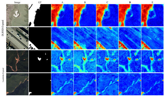 Based on Table 6, the Tok-KAN enhanced the model’s ability to capture and represent complex, nonlinear relationships in remote sensing images, particularly in challenging scenarios such as heterogeneous terrain features and landslide regions. As shown in Table 6, the Tok-KAN significantly improved the model’s ability to distinguish complex interclass feature relationships on the DLRSD Expand dataset. This capability is essential for handling the diverse natural characteristics found in remote sensing images, where conventional models often struggle to manage the unpredictability of object boundaries and intricate terrain patterns. The Tok-KAN’s performance improvement in terms of the IoU (+1.16%) and F1 score (+0.77%) on the DLRSD-Expand dataset highlights its ability to model nonlinear features, outperforming the baseline U-Net++ and U-KAN models.